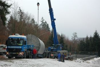 Im Jänner 2008 wurden dann mit zwei Schwertransportern die 7 Meter hohen Behälter mit je einem Durchmesser von 4,25 Meter angeliefert. Alleine der Transport von der Bundesstrassenkreuzung beim Kaufpark Walding bis zum Aufstellungsort oberhalb vom Hambergwirt dauerte 2 Stunden. Ein Schwerlastkran hob dann die zwei Riesen in die Betonwanne.