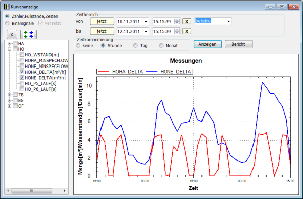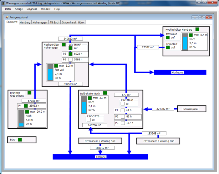 Alle Füllstände, Wasserdurchflussmessungen, Ventilzustände, Störzustände,