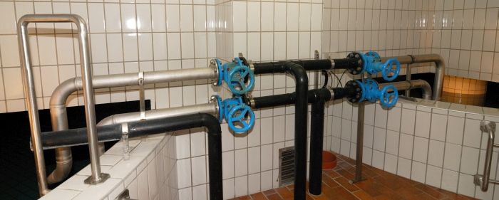 Dies ermöglicht ein Abschalten von sehr begrenzten Leitungssegmenten im Fall von Rohrbrüchen oder Arbeiten an Leitungen - Wasserbehälter werden in periodischen Abständen mit einem Hochdruckreiniger gereinigt.